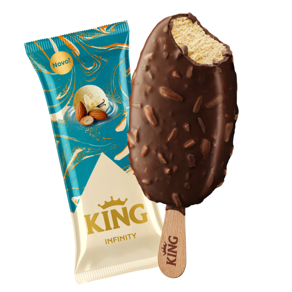 Za ljubitelje vanvremenskih poslastica stiže novi KING sladoled na štapiću. Uz KING Infinity uživajte u poznatom ukusu koji traje i nastavlja tradiciju omiljenog KING užitka. Ovaj sladoled donosi kremasti ukus burbon vanile, prekriven mliječnom čokoladom s komadićima badema koji daju prepoznatljivu hrskavost. Pronađite i druge KING sladolede na linku.