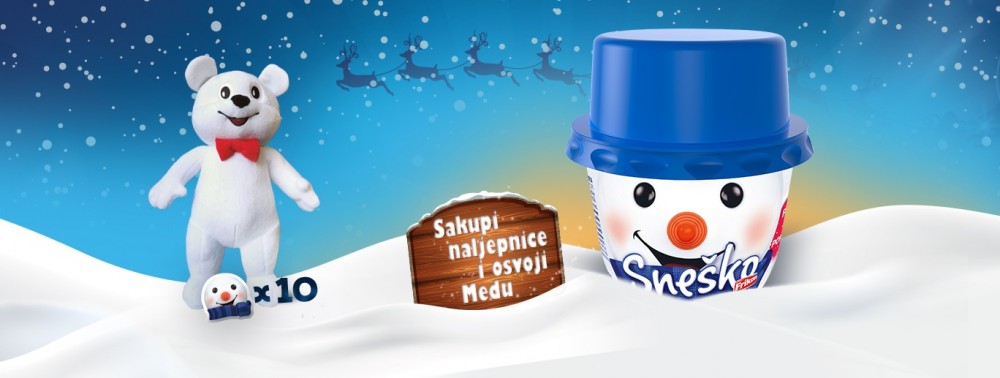 Kupite sladoled Sneško čašica i u poklopcu vas čeka iznaneđenje. Sakupite deset naljepnica koje Sneško krije ispod kape u periodu od 20.11.2017. do 07.01.2017, zalijepite ih na flajer i pošaljite ga na našu adresu, a mi ćemo vam poslati poklon - plišanu igračku Medu.