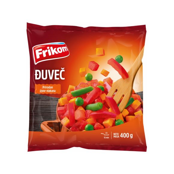 Frikom miješano povrće za đuveč se sastoji od rezane crvene paprike, graška, zelene boranije, kao i šargarepe i paradajza u kockicama. Ova mješavina dobra je za pripremu sočnog priloga sa dodatkom pirinča i uz mesna jela, a može koristiti za kuvanje različitih tjestenina ili lazanja sa povrćem.